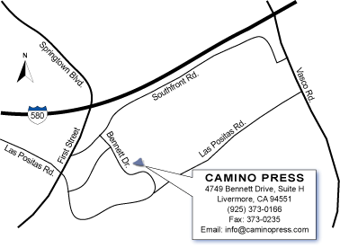 From 580 - Take First Street exit and go south towards Livermore. At the first light, turn left onto Southfront Road. Turn right onto Bennett Drive. Camino Press is located in the third building on the left side of the road. We are in Suite H, which is in the center of the building. |
